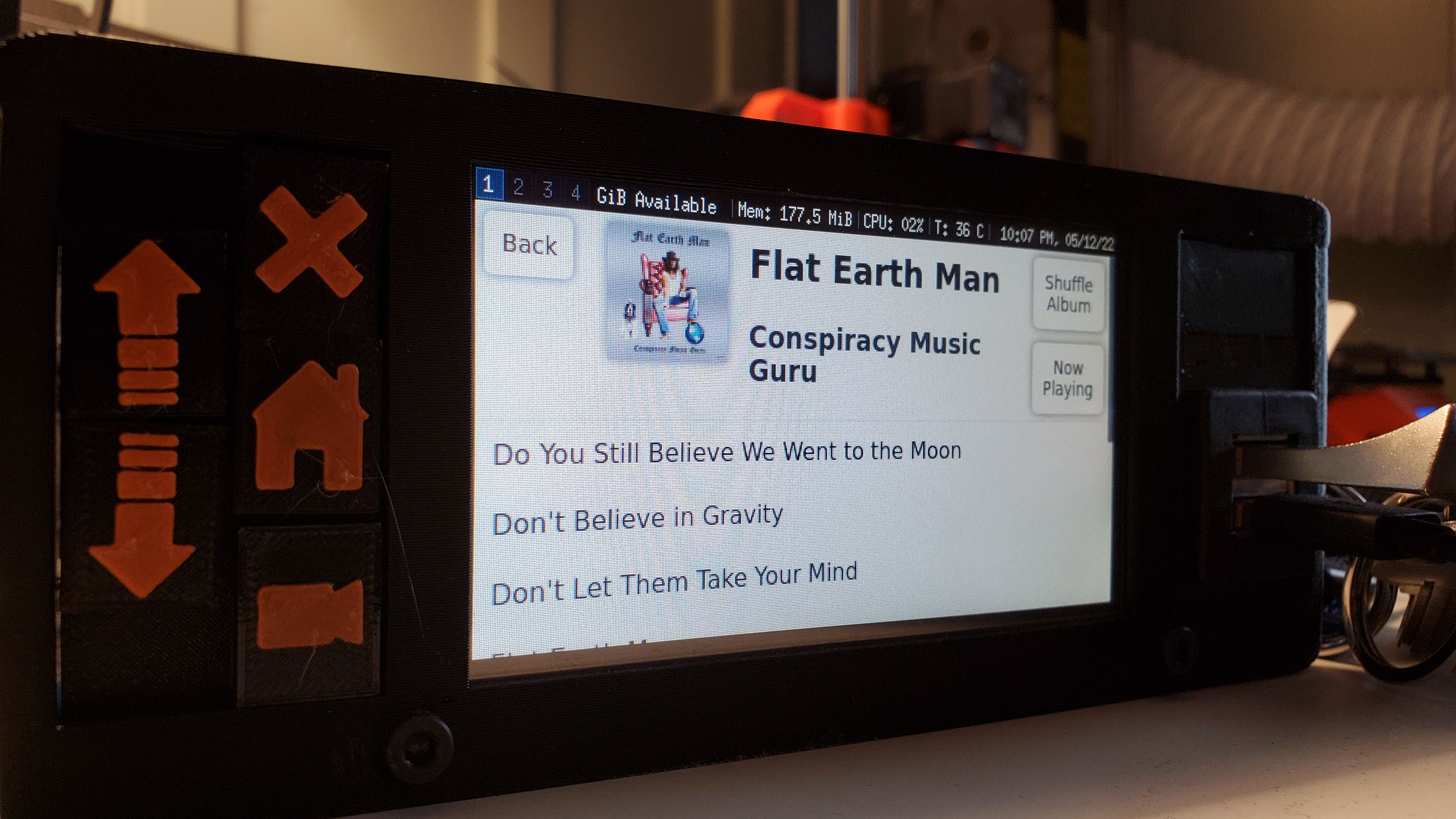 The Car Computer started out as just a screen, a Raspberry Pi, and a whole rat's nest of cables hanging off my desk while I proved that I could get a usable linux system running on such a small screen. Once I got my OS set up, I designed the entire car computer in a CAD program, a difficult task that involved multiple revisions to get the mounting positions just right so that it fits into the car. In particular, I had to move the Raspberry Pi up high to clear a metal tensioning strap mounted to the back of the radio. After I had printed all the parts and assembled the computer, I began working on the software. A quick python script utilizing the i3-ipc library allowed the buttons to control opening and closing windows. Unfortenately, I was unable to find a music player that worked well on such a small screen so I had to code one myself. For this I faced a difficult decision between using the familiar JavaScript programming language or the much faster Rust programming language. I eventually ended up using a combination of the two (rust for indexing songs, JS for playing songs and the interface) because JavaScipt was just too slow at indexing the music.