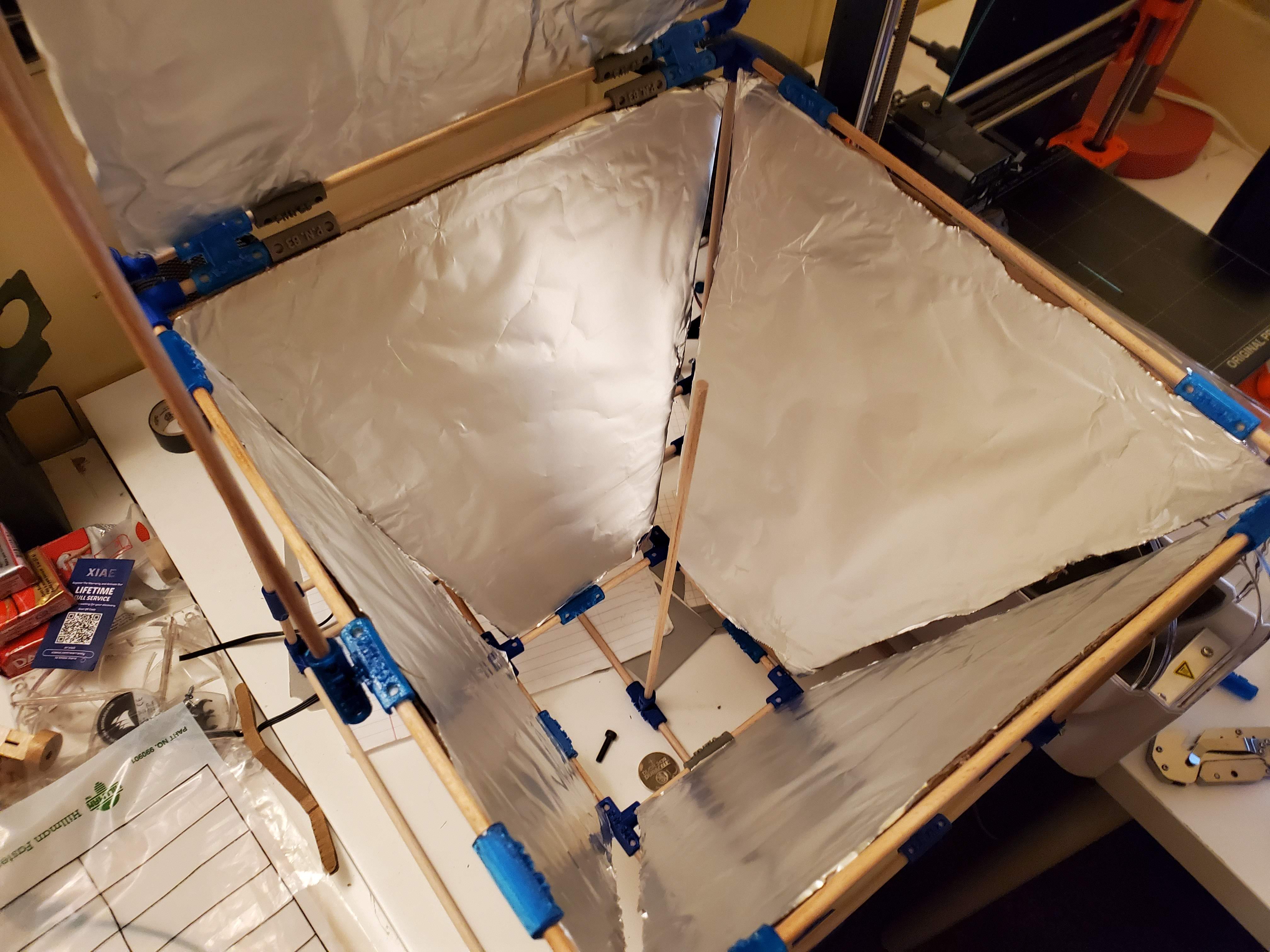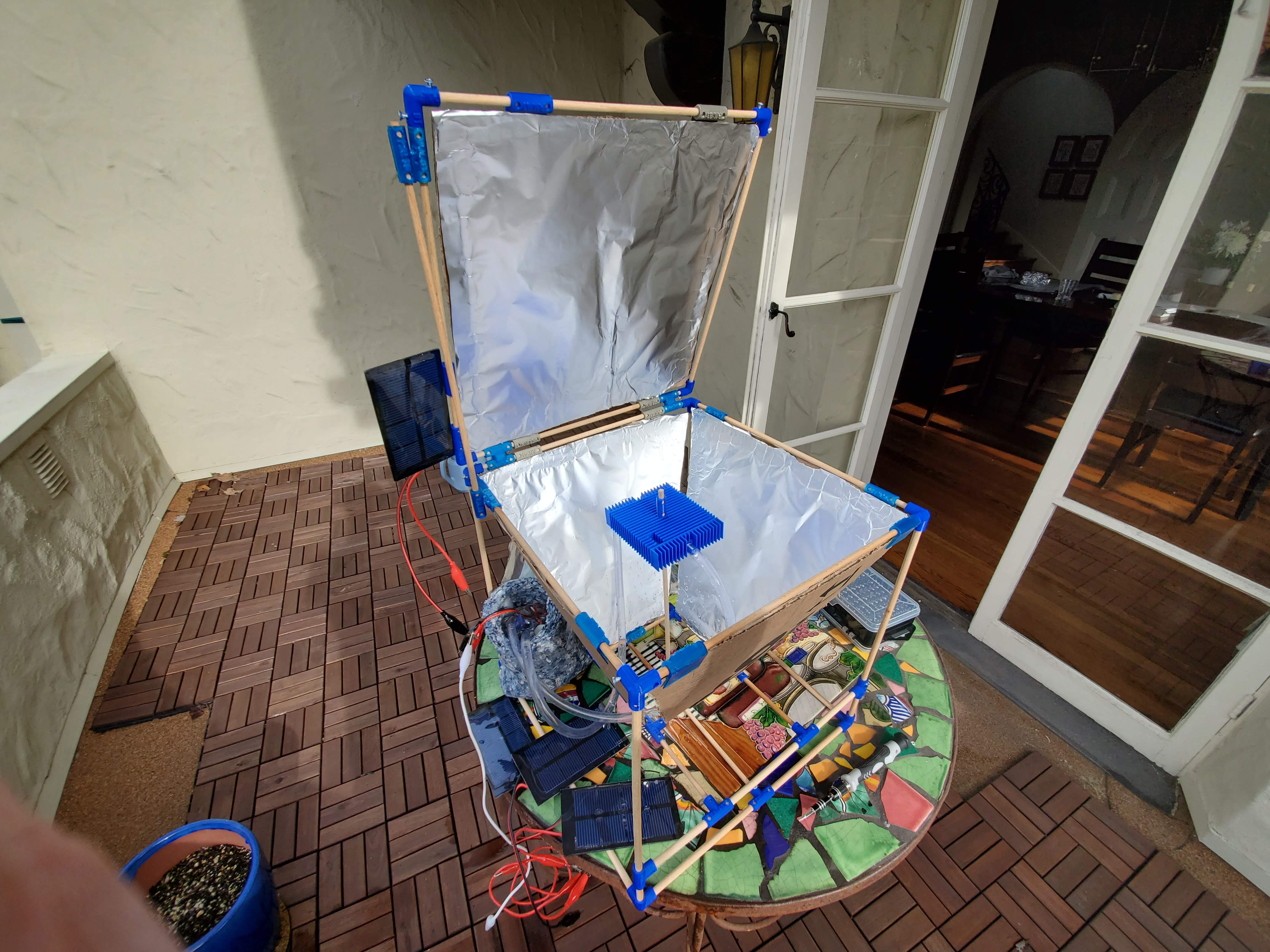 The main concept of my water heater was pretty simple, pump water from a resorvior to a heating element, which is located above an inverted pyramid shape lined with reflective aluminum foil, and then back into the reservior. Above the pyramid was a reflective cover flap that could be adjusted to angle the sunlight directly downward into the pyramid. Unfortenately, I don't have access to a CNC machine, so I had to 3D print the heating element, which to no one's surpise didn't work very well. The highlight of my project was the modular design of it. It was entirely constucted from cheap wooden dowels and custom 3D printed brackets, with holes for set screws to hold the dowels in place. This allowed for extemely minimal use of glue and tape, giving it a large real world advantage in that it is durable and repairable while being no harder to assemble then something made out of cardboard and tape, which was typical design in my class.